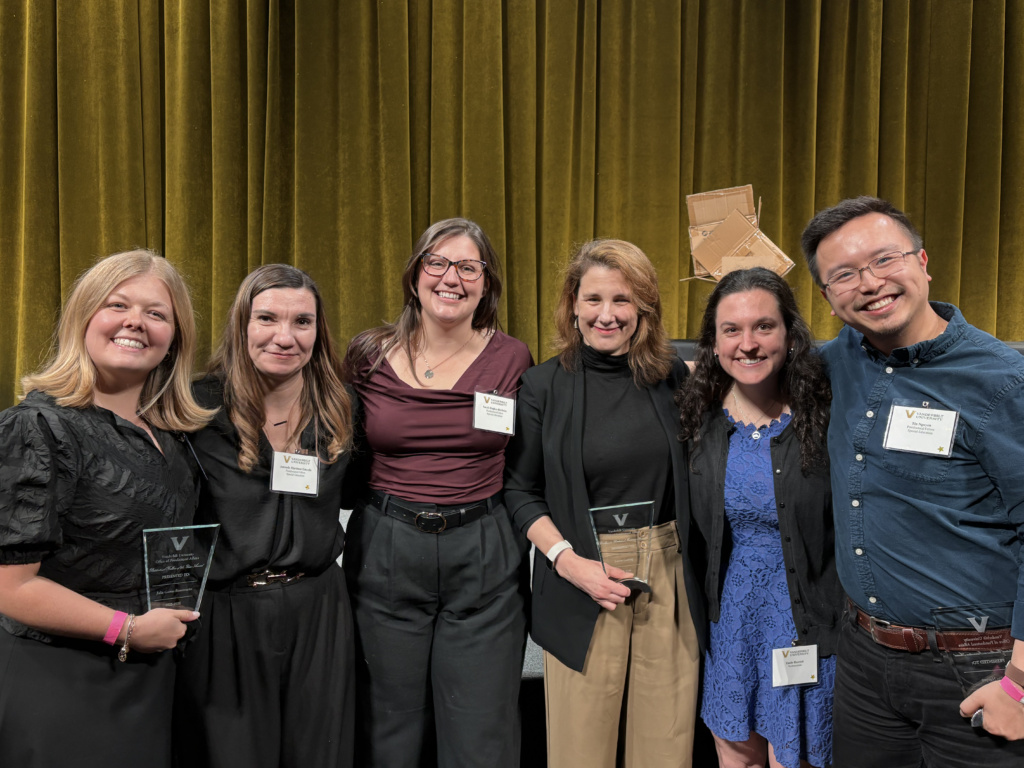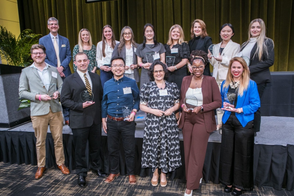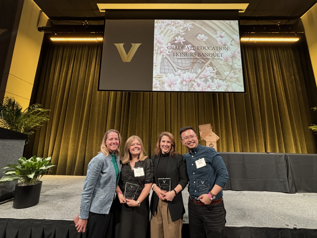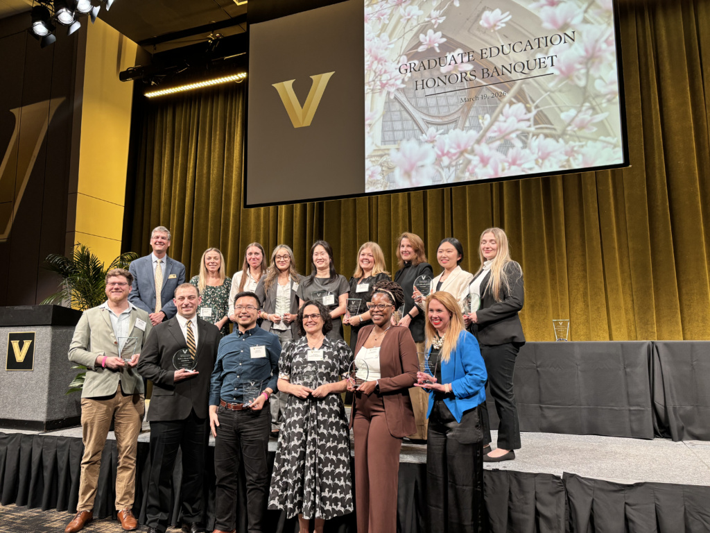 On March 19th, Vanderbilt held their annual Graduate School banquet and held their Postdoctoral Awards Ceremony simultaneously, bringing the two events together for the first time. Yearly this awards ceremony is held to honor those within the Vanderbilt community that have demonstrated exceptional leadership, excellence in academics, innovation, and mentorship. This year, our lab is overjoyed to report that multiple members of our lab were given distinctions that highlight their dedication to innovation in research.