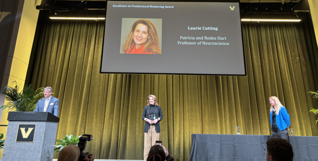 Dr. Laurie Cutting was awarded the Excellence in Postdoctoral Mentoring Award; an award that the graduate school describes: “The recipient must demonstrate a willingness to share expertise and advice; services to the community at large, including other mentoring activities; and scholarship within the mentor’s own career, including publications, awards, presentations and honors.”